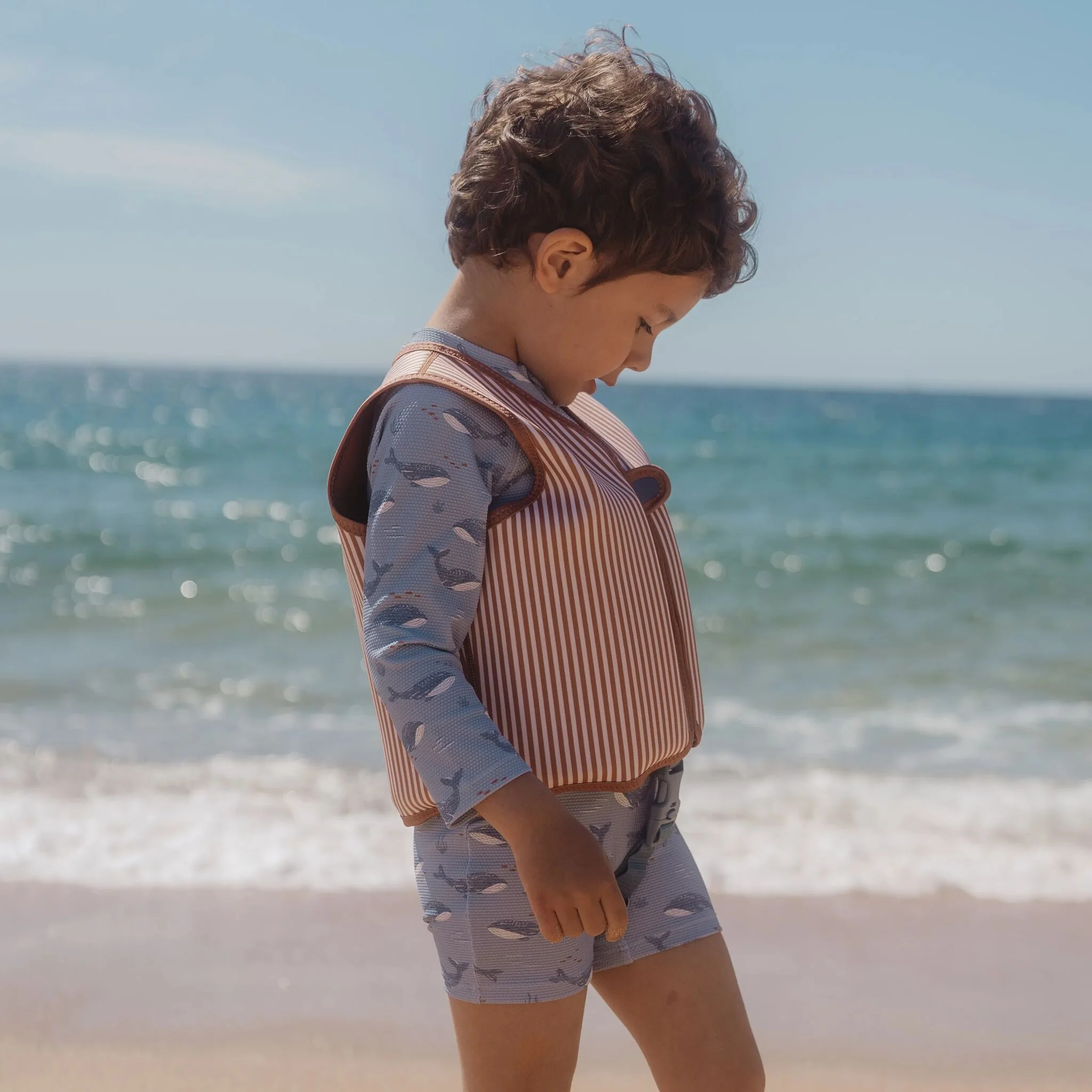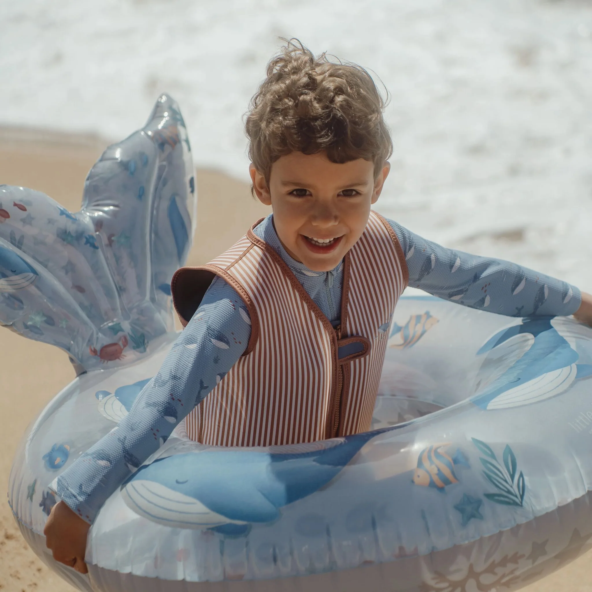 Este resistente chaleco salvavidas marrón de Ocean World es el compañero ideal para los pequeños amantes del agua. Con un alegre diseño de rayas y un adorable estampado de ballenas, este chaleco no solo es funcional, sino que también llama la atención en la piscina o en la playa. Su diseño sin mangas y su cómodo cuello en V garantizan una libertad de movimiento óptima. Gracias a su resistente cierre de velcro y cremallera, el chaleco salvavidas es fácil de poner y quitar. Fabricado con un material suave y duradero, ofrece flotabilidad adicional y ayuda a los niños a explorar el agua con confianza. Nota: este producto es un dispositivo de flotación, no un chaleco salvavidas. Utilizar siempre bajo la supervisión de un adulto.