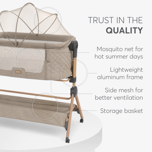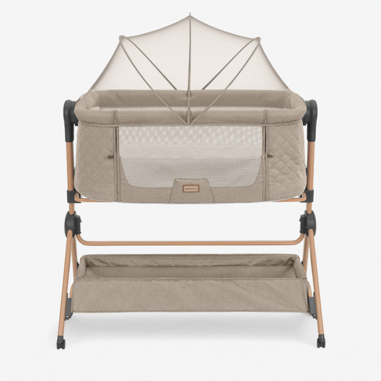 - Minicuna colecho – Adecuada desde el nacimiento hasta los 6 meses (hasta 9 kg), con altura regulable, posición antirreflujo, laterales de malla para una correcta ventilación, lateral abatible y correa de fijación para sujetar la cuna a la cama de los padres y favorecer un descanso tranquilo.