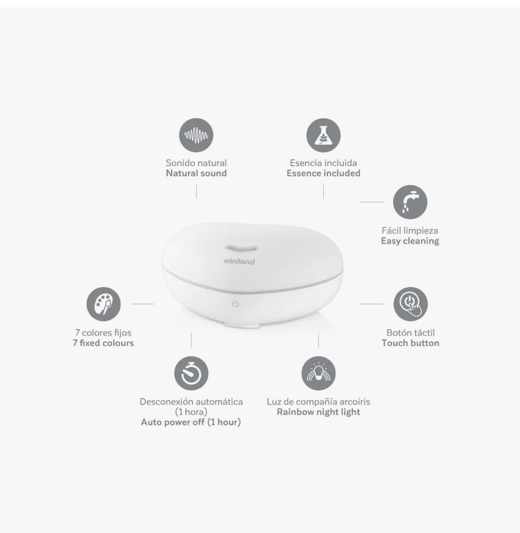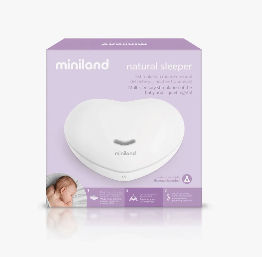 Estimulación multi-sensorial del bebéy…¡noches tranquilas!Gracias a su triple funcionalidad de generación de sonido, luces de colores y aromas, natural sleeper estimula los sentidos del oído, la vista y el olfato del bebéde manera simultánea, para potenciar el inicio y la profundidad del sueño de una forma natural, en una plácida atmósfera de calma.El sonido ideal para el bebéEl sonido natural programado en natural sleeper estáespecialmente diseñado para calmar al bebé, induciendo a un sueño relajado y profundo. Además, ayuda a enmascarar cualquier sonido de ambiente que pueda despertar al más pequeño: la vida es ruidosa, ¡pero no tiene que molestar al bebé!Aromaterapia: hoy y siempreLos beneficios de la aromaterapia están extensamente demostrados, y se basa en determinados olores que ayudan al bebéa tener una mayor fortaleza psíquica y física, además de que contribuyen a equilibrar su energía y a sentirse bien por dentro. Por ello natural sleeper vaporiza en frío mediante vibraciones ultrasónicas, dispersando suavemente fragancias naturales en la habitación del bebé, creando una atmósfera de paz, transmitiéndole una sensación de bienestar y ayudando a su relajación, tanto para quedarse dormido como para favorecer la inducción al sueño profundo. Luz al gusto del pequeñoLos papás podrán elegir entre el modo de luz multicolor o el de luz fija, creando el entorno perfecto para el bebé, estimulando la secreción de melatonina, lo que le ayudaráa alcanzar un sueño profundo, pacífico y sereno. Además la luz de compañía, que ayuda a los bebés a sentirse seguros en la noche, es fría al tacto. Sonido, luz y aroma independientes y combinables, de modo muy sencillonatural sleeper se adapta a las necesidades de cada bebéy papá, ya que incorpora cuatro modos de funcionamiento que se activan a través de su botón táctil, de manera que el sonido, la luz y el aroma pueden usarse combinados o de manera independiente. Con autoapagado y desconexión automática natural sleeper permanece encendido durante una hora para asegurar que el bebéconcilie el sueño, momento en el que se apaga automáticamente. Además, en el caso de que se agote el agua del depósito durante su uso, se desconectará.