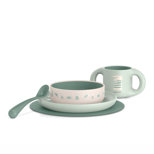 Vajilla compuesta por plato llano y bol de gran capacidad, taza con grandes asitas que facilitan su agarre, cuchara ergonómica ideal para papillas y potitos, y mantel antideslizante que evita que el plato se mueva.