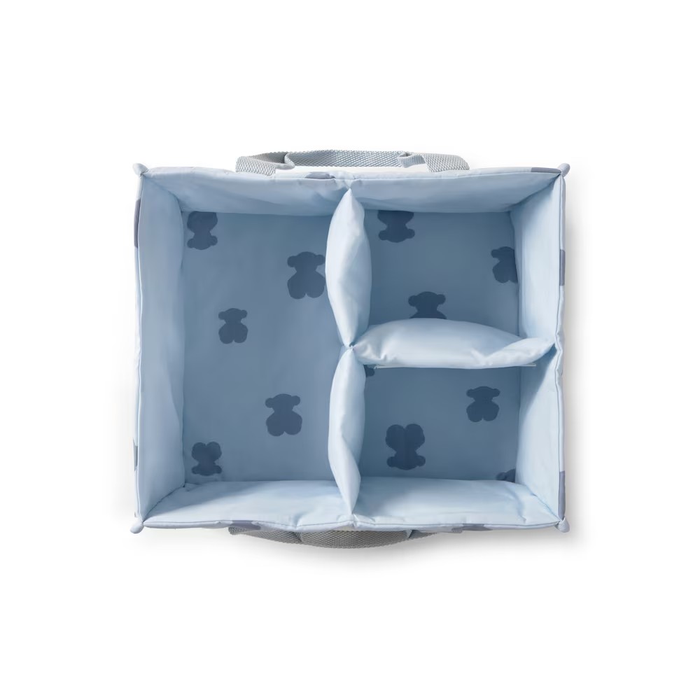 Organizador de mesa Tous Baby confeccionado en algodón estampado con osos. Tres compartimentos para almacenar y dos asas a los lados. Composición: 100% Algodón. Medidas: 30x25x16cm.  Fabricado en la UE. Etiquetado GREENABLE: Certificado OEKO-TEX*. Los tejidos OEKO TEX* Standard 100 certifican que se ha realizado un control en todas las etapas de fabricación: materias primas, fibras y tintes. De esta manera, aseguran no contener materiales nocivos para la salud ni para el medioambiente. Detalles: Lavar antes de usar, lavar con colores similares, no secar en secadora, lavar 30º.
