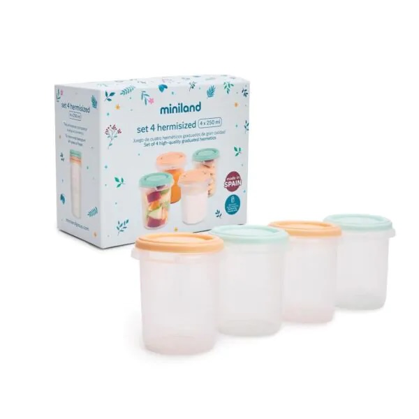 El Set de 4 Hermisized 250 ml de Miniland está compuesto por cuatro recipientes herméticos del mismo tamaño, diseñados para facilitar la conservación y organización de la alimentación del bebé. Su capacidad de 250 ml resulta adecuada para una amplia variedad de tomas y preparaciones.
