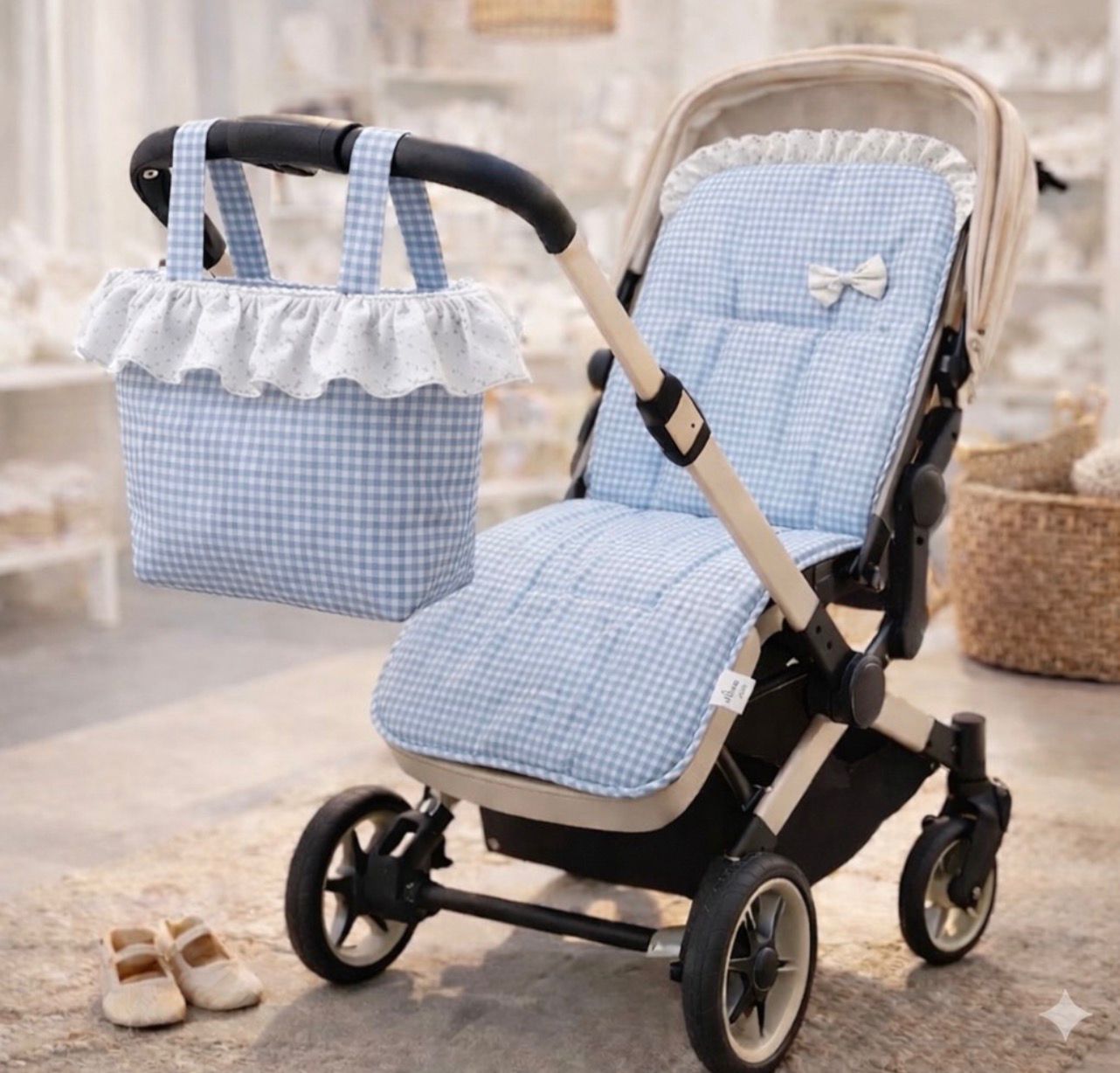 Elegante set para carrito de bebé compuesto por colchoneta universal y bolso a juego, confeccionado en delicado tejido vichy que aporta un estilo clásico y muy dulce. La colchoneta está acolchada para mayor comodidad del bebé y decorada con lazos decorativos, además de un volante en tejido blanco con pequeños detalles bordados que añade un toque romántico y sofisticado.