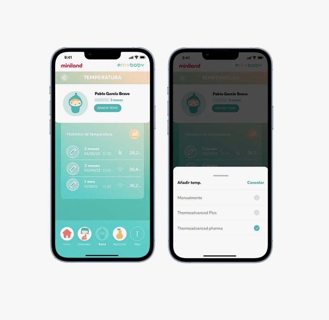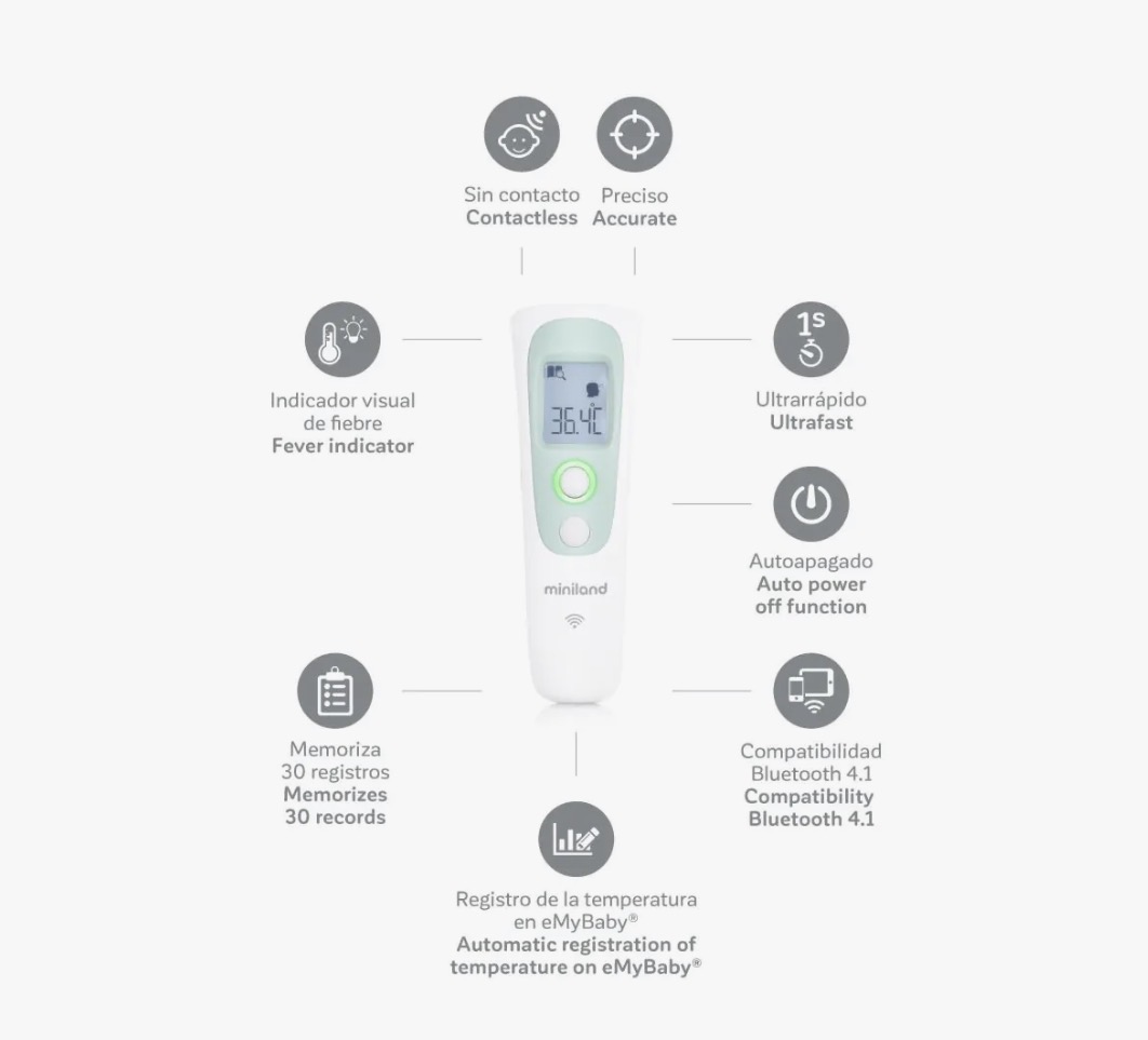 Registra la temperatura a través de eMyBaby®A través de la aplicación eMyBaby, thermoadvanced pharma se comunica con el smartphone y la Tablet para registrar las temperaturas tomadas, pudiendo llevar un seguimiento de las mismas en cualquier momento y lugar. Es posible utilizar el termómetro de forma aislada o con eMyBaby®.Medición rápida, precisa y sin contactoMide la temperatura en tan solo 1 segundo sin contacto en la frente. Además, el botón de medición cambiar de color de verde a rojo cuando se detecta una temperatura corporal superior a 38ºC.Permite consultar y compartir los registros de temperaturaLos registros tomados quedan memorizados tanto en el propio termómetro como en eMyBaby®y pueden ser consultados en cualquier momento, permitiendo ver la evolución de la temperatura del bebé. Además pueden guardarse en el PC o enviarse por email.El más completo: para el agua del baño, el biberón o la papillathermoadvanced plus mide la temperatura de objetos y de líquidos asícomo la temperatura ambiental.Desconexión para ahorrar energíathermoadvanced pharma se apaga automáticamente a los 3 minutos de estar en reposo, permitiendo asíun mayor ahorro de energía y mayor duración de las baterías.
